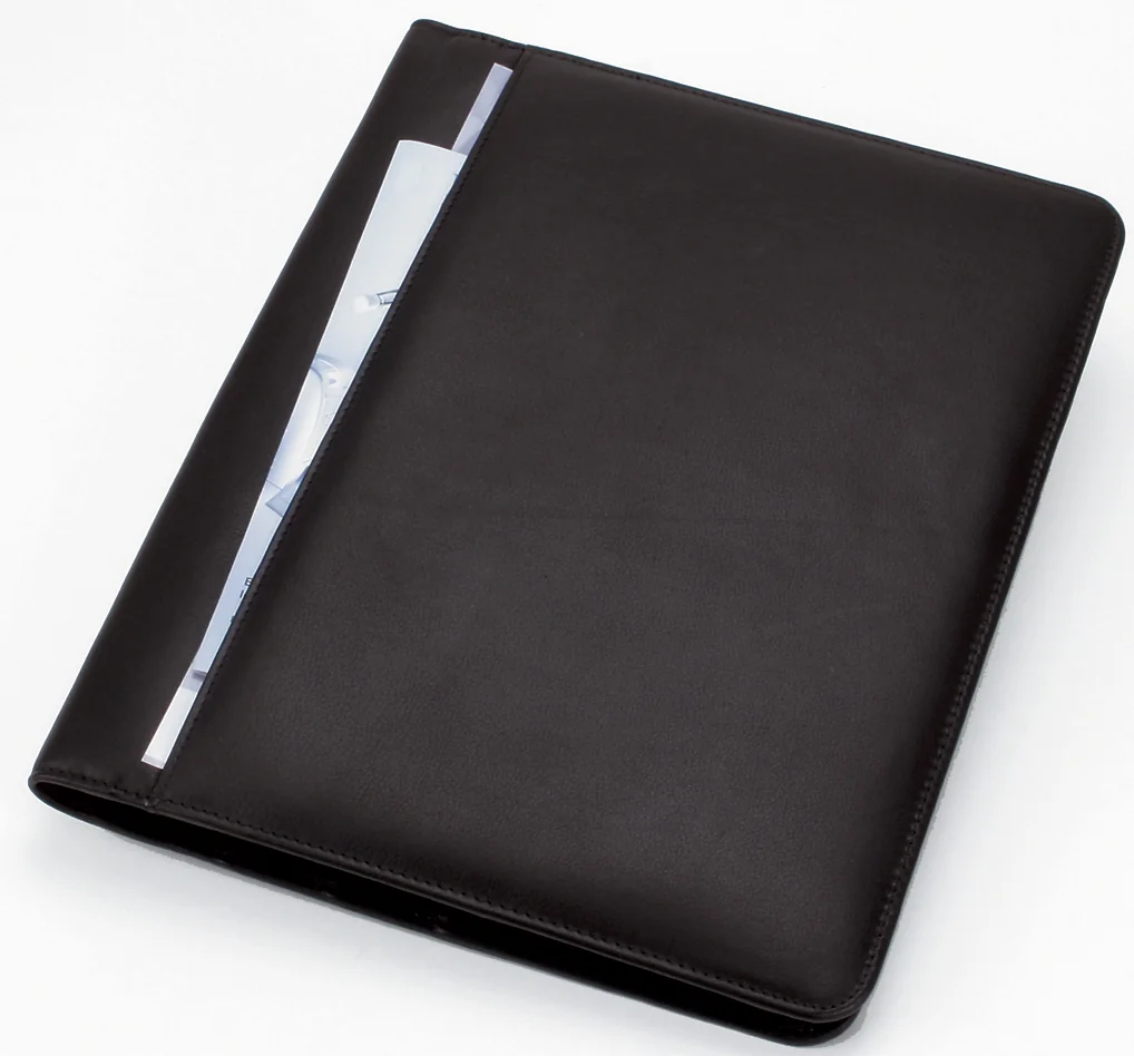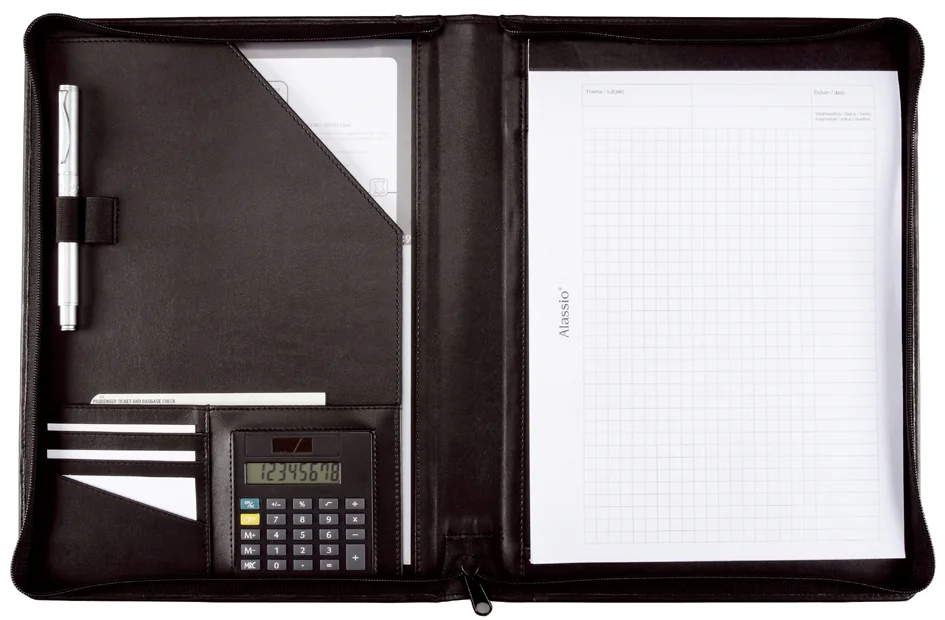 Equipement: fermeture à zip tout autour • calculatrice • bloc • trois compartiments pour cartes de visite • compartiment pour format A4