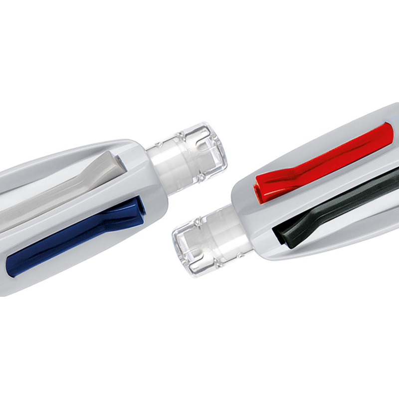 • 4 couleurs sur un stylo: bleu, noir, rouge et mine de crayon