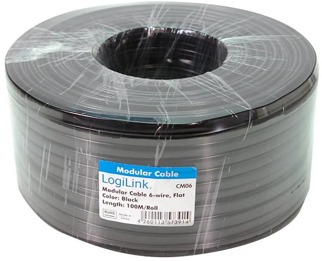 LogiLink Câble téléphonique, 100 m, 6 fils, plat, noir