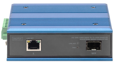 DIGITUS DIGITUS Indu 10/100/1000BaseTX – 1000Base-FX, connectique: 1x RJ45, 1x SFP, supporte half et full duplex, mécanisme interne de sauvegarde et de transmission, alimentation redondante: 12-48V DC avec protection contre l’inversion de polarité