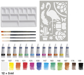couleurs intenses et brillantes, peut se dissoudre, miscibilité parfaite des tons, flux optimal de la peinture, contenu: 12 tubes de 5 ml, 4 pinceaux synthétiques, 1 pochoir et 1 palette (169618)