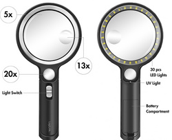 LogiL Lupe WZ0075 diamètre: 90 mm, lentille en verre, grossissement: 5 fois, 13 fois & 20 fois via 2 lentilles supplémentaires d’un diamètre de 21 mm, avec 30 LED, avec 3x piles AAA, dimensions: (L)108 x (P)25 x (H)230 mm