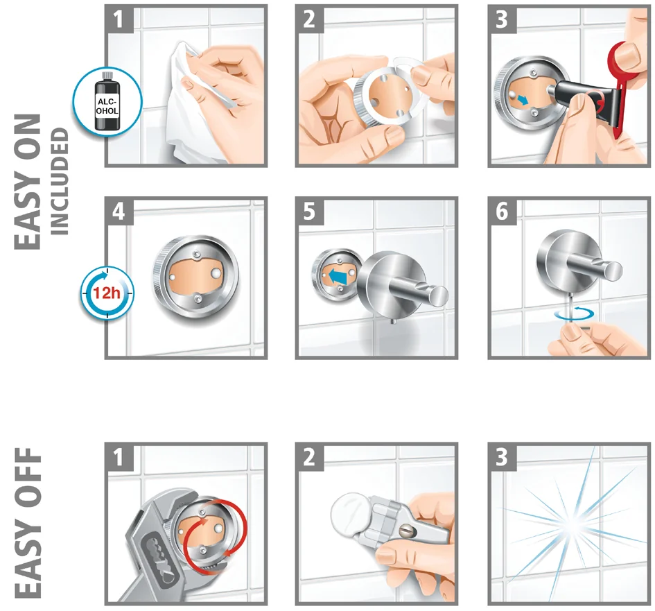 Étapes d’application : nettoyer le support, coller l’adaptateur de fixation sur le support, remplir de colle, laisser sécher pendant 12 heures, fixer le support Convient pour : carrelage, métal, pierre naturelle, marbre, verre, bois, divers plastiques Ne convient pas pour : plâtre, papier peint, textiles muraux et plastiques tels que PP, PE et PTFE